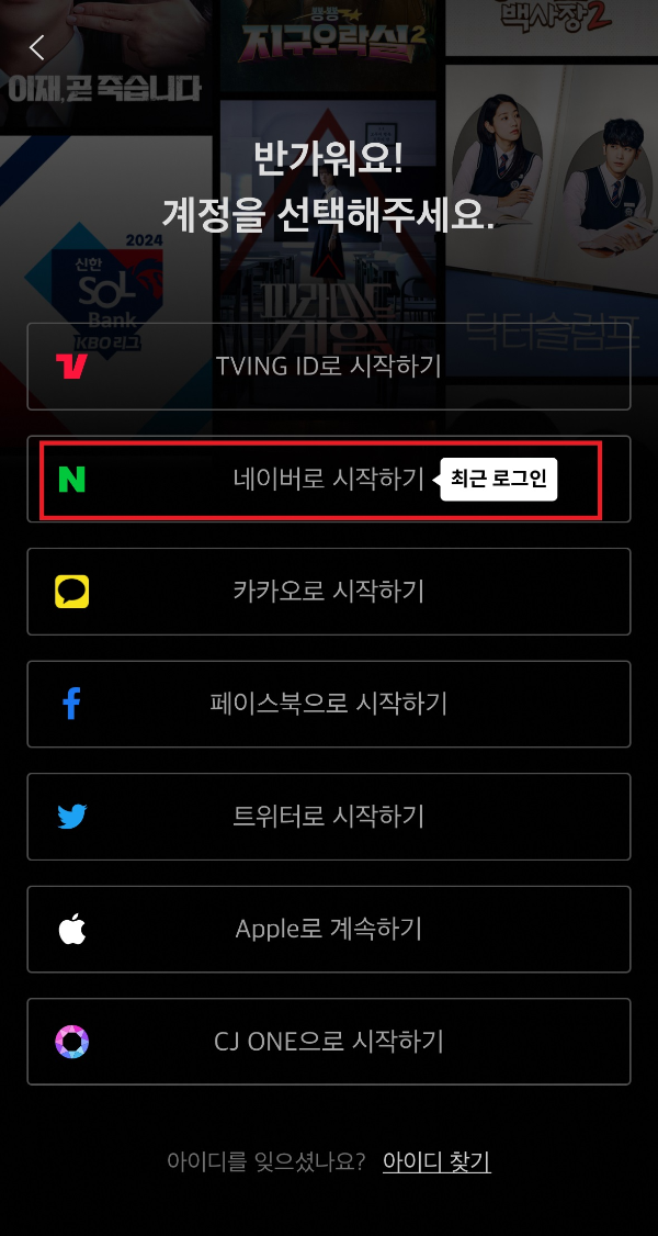 3) 이제 티빙에 들어가 네이버 ID/PW로 로그인하세요. 그럼 이용권에 아래와 같이 표시되며 바로 티빙 한달 무료 시청이 가능합니다!
