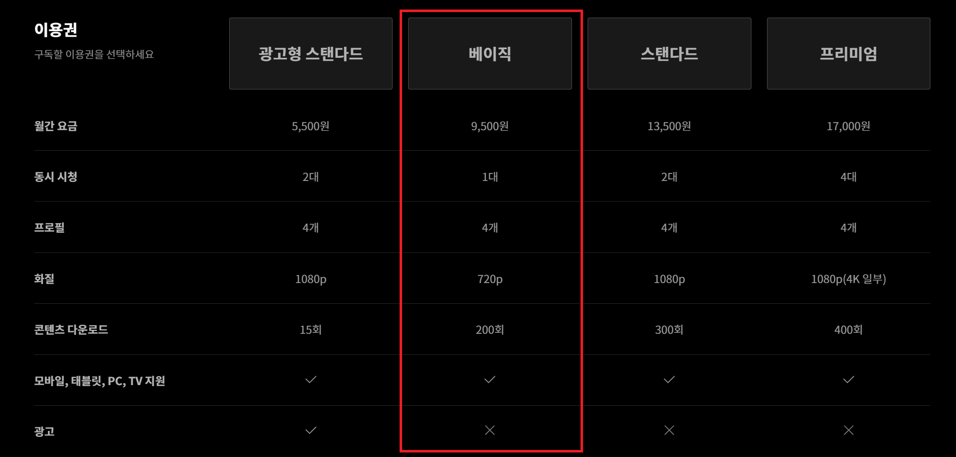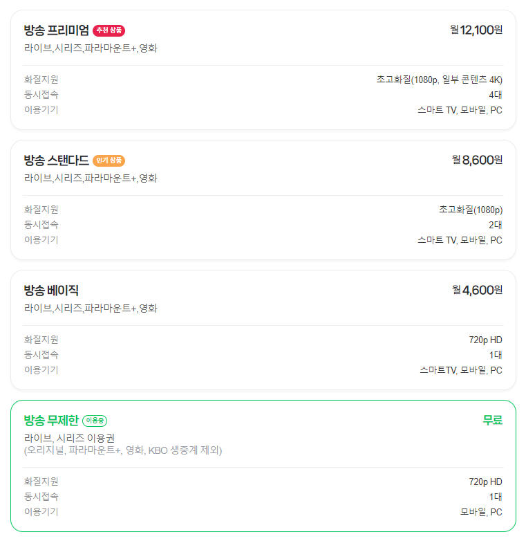 영화나 티빙 오리지널, KBO 등 스포츠 경기를 많이 보시는 분들이라면 방송 베이직으로 업그레이드하시는 걸 추천드려요.