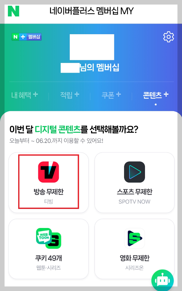 2) 가입을 완료했다면, MY네이버플러스 멤버십 창에 들어가 [콘텐츠+ ]항목을 클릭, 혜택 중 [티빙 방송 무제한]을 선택하세요.